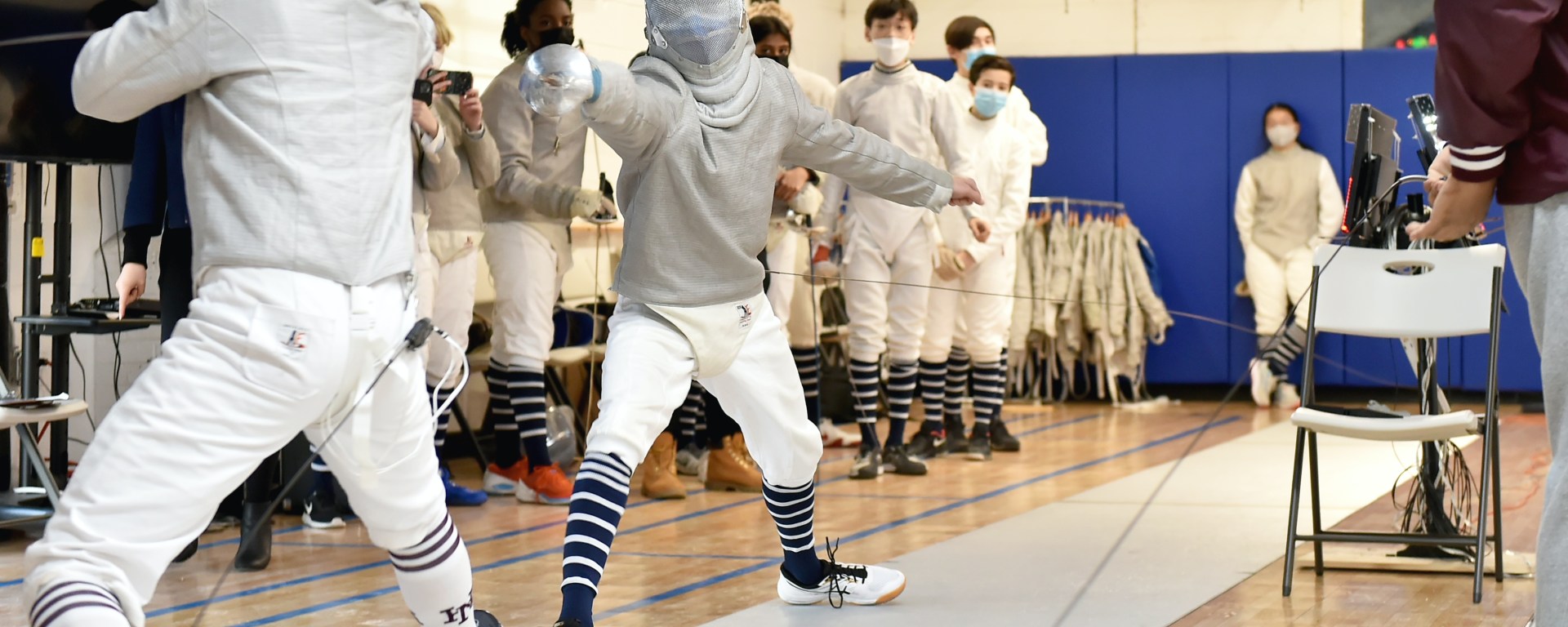 The shuffle of steps and engagement of blades ring throughout the air as two figures dance on a metal piste, their feet moving stylishly in a meticulous and elegant manner. Behind each, their teammates huddle together expectantly, eyes glued onto each respective figure. After more thrusts, followed by a clash of blades, an explosion of green and red illuminates the room. All seems to go silent as the two fencers spring apart, each raising a fist to the sky. Everyone turns to stare at a man in a suit, who announces, “Attaque. Parry. Riposte. Touche.” He lifts his arms, making a series of movements before raising his right palm and turning it outwards. It isn’t long before the right side of the room erupts into cheers and one figure rips off his mask, letting out a passionate yell.
