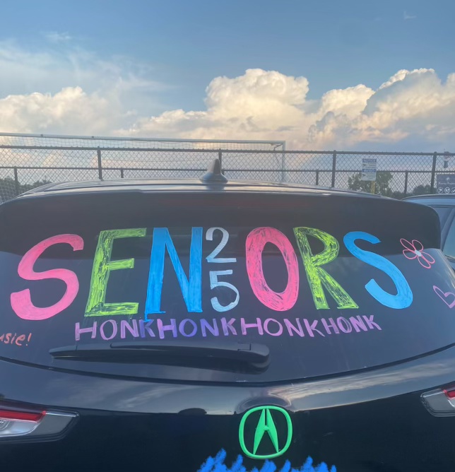 During preseason, before school starts, seniors participate in car decorating where they use markers to draw and write on cars to celebrate their last high school year. They write expressions such as “honk twice for seniors” or “senior szn”. The “last first day” is also an event that seniors look forward to as it has occurred for a numerous amount of years. Most girls wear white outfits, and seniors use mini backpacks to commemorate their childhood. These backpacks typically have images of children’s tv shows or characters, ranging from Peppa Pig to Sofia the First to Paw Patrol. One of the Spirit Club representatives, Evie Shurslep’s ‘25 favorite senior traditions is “all the senior girls wearing white dresses on the first day because we also wear them for graduation, so it is a cute full circle tradition”.