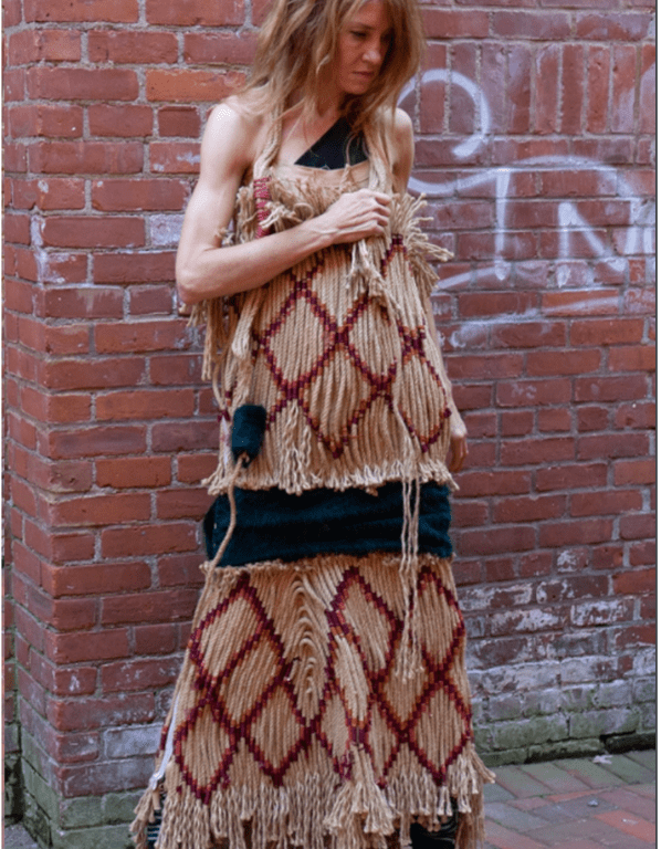 Since then, Lynch has made a myriad of pieces that incorporate transformative aspects. Her favorite collection, Chrysalis, embodies these aspects as her clothes draw inspiration from the metamorphosis of a butterfly. In this collection, Lynch made a poncho out of Mohair fabric and grassy cotton bland to evoke ties to nature. That very poncho can be transformed into a skirt and overalls. Lynch has also made pants out of hand-woven rope textiles that transform into a bag, dress, and scarf, showcasing the versatility and imagination in Lynch’s designs.