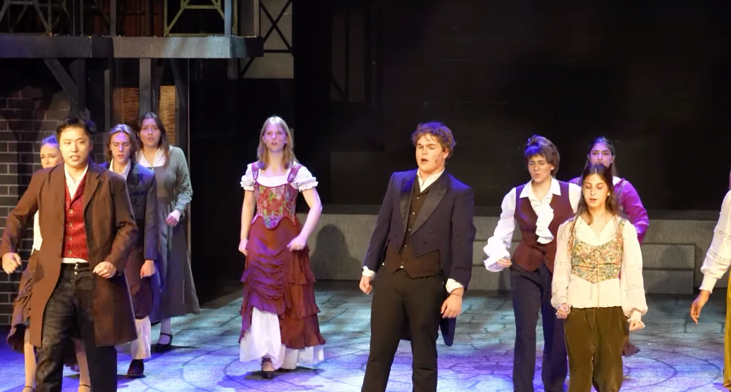 Sussman’s sopranic melodies blended well with Valenton’s lower harmonies—most notably, their acting and singing shone through in “In My Life” and “A Heart Full of Love.” Similarly, Alvarez’s acting as Éponine shone through in “On My Own,” the second song of Act 2 that featured Éponine’s dismay at her unrequited love for Marius. Millowitz and Kroin also shared remarkable chemistry as the Thérnadier duo, providing much-needed comedic relief between emotionally intense moments. Lincoln Feng ‘26 must also be commended for his role as the French revolutionary Enjolras, who brought the dramatic intensity to songs such as “Red & Black” and “Do You Hear the People Sing?”